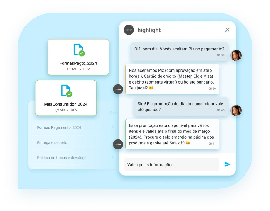 Realize o upload de documentos da sua empresa e dê contexto para que a IA possa compreender o seu negócio